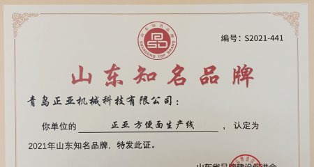 2022/01/05青島正亞機械科技有限公司再創(chuàng)新高,我司方便面生產(chǎn)線榮獲山東省品牌建設(shè)促進會頒發(fā)的“山東知名品牌”榮譽證書。